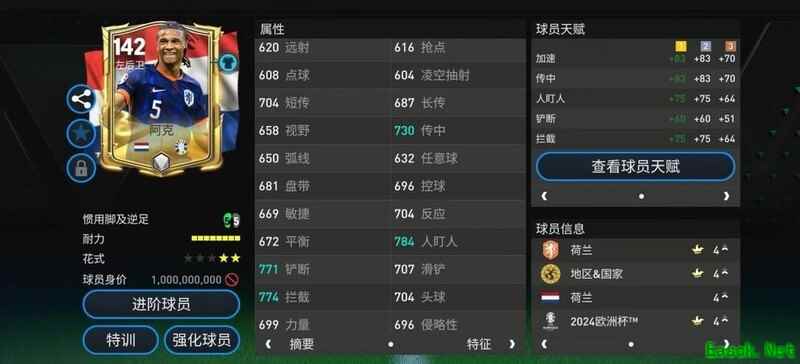 阿克在天赋方面选择了边后卫常用的角斗士属性,这项天赋使他在加速、传中、人盯人、铲断和拦截等关键能力上有明显提升。经过天赋加成后,他在铲断、拦截和防守盯人等数据上均突破770,防守能力更加稳固。即便是在未受天赋加成的项目中,如短传、滑铲和反应速度等方面,他的数据也都维持在700以上,整体能力表现十分均衡且出色。