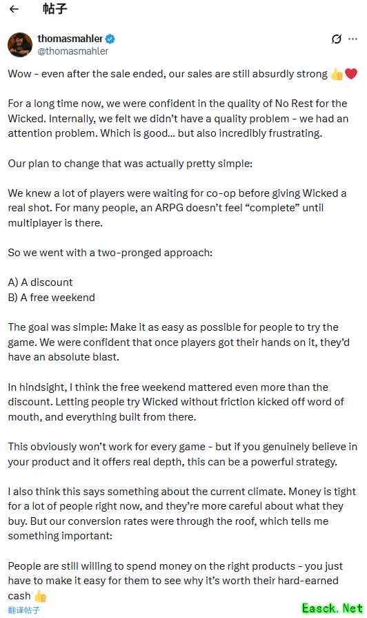 “哇——即便促销结束后,我们的销量依然强得离谱,”他在推特上写道。他解释称,自己早就意识到许多ARPG玩家一直在等待合作模式,因此才决定通过折扣和免费试玩周尽可能放大这次更新的影响力。“目标很简单:尽可能降低玩家尝试游戏的门槛。我们有信心,一旦玩家真正上手,就一定会玩得非常开心。”