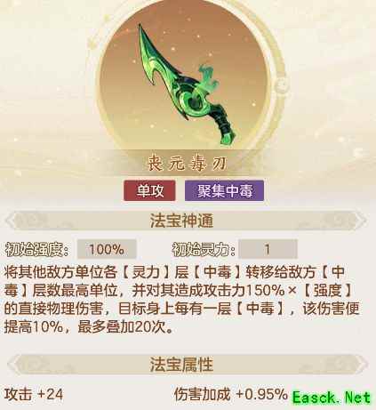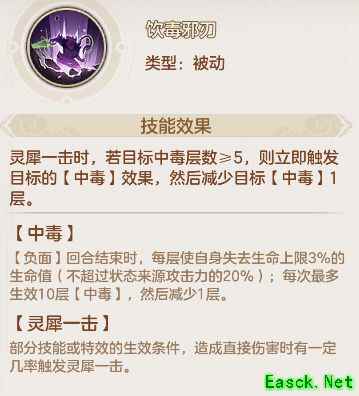 丧元毒刃可将敌方单位的中毒效果集中至中毒层数最高的目标,同时触发一次物理伤害,层数越高伤害越强,是毒队爆发点杀的核心技能。具备聚毒与高爆发特点,单体输出倍率优秀,建议优先提升灵力与强度属性。