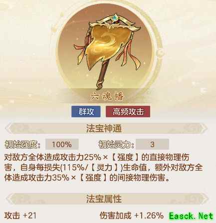 六魂幡对敌方全体造成物理伤害后,还会根据目标当前生命值多次触发间接物理伤害,血量越低触发频率越高。适合配合需压低自身血量的英雄使用,如阿修罗。培养时需主堆灵力并兼顾强度。