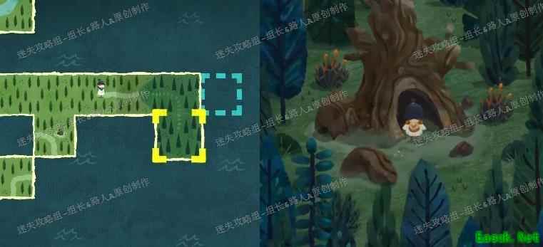 迷雾森林前两阶段未用的区块,结合小飞机信获得的碎片,可拼成新路径,生成一棵树,进入其树洞。
