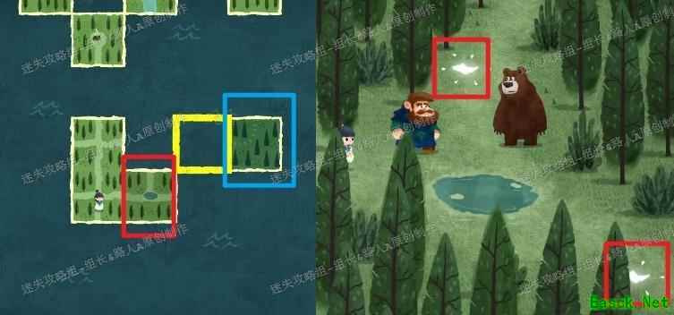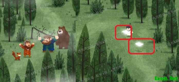第一阶段结束后会进入过渡环节,图中红框与蓝框区域均属于前一阶段的范围。蓝框区域后期才会使用,当前应先连接红框区域并前往,途中将遇见棕熊大叔,触发对话剧情并获得两块碎片,这两块碎片用于开启第二阶段的迷雾森林,拾取后即可正式进入下一阶段。