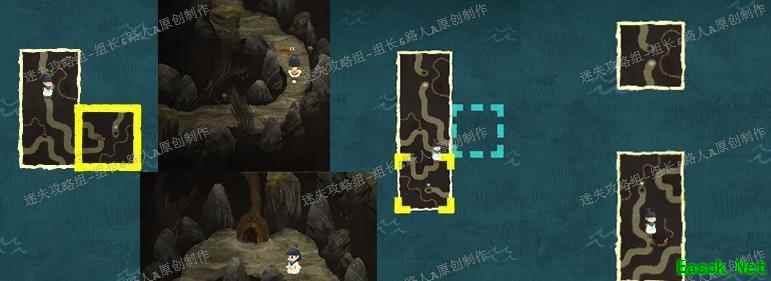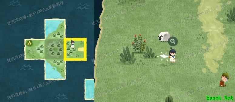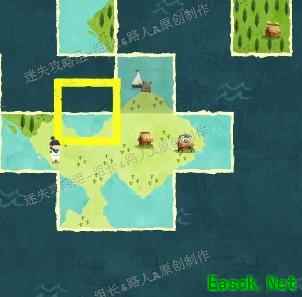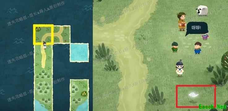 将地图按图示拼合,原本空缺的中央区域会在周围四块完成后显现。进入中央区域找到第四只羊,与其互动后带至男孩身旁。再次与男孩对话推进剧情,主角昏睡后,附近一只羊会异常地来回跳跃,上前与其对话即可获得新的地图碎片。
