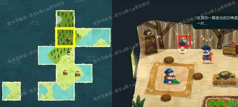 将图中红框内的地形拼合,即可显现海边小屋(其余部件无需完全组装),靠近可触发剧情,同时在蓝框位置获得新碎片。