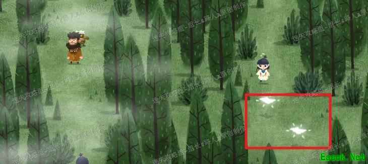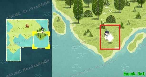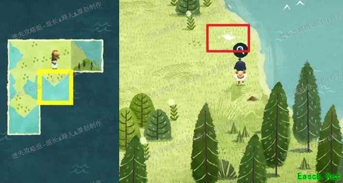 完成剧情触发后,需寻找森林中的那户人家。先将所有地图拼合,前往小男孩所在位置。当两只粉色边框的海鸟从身旁飞过时,会留下两个地图碎片,拾取后发现是森林区域的拼图部分。