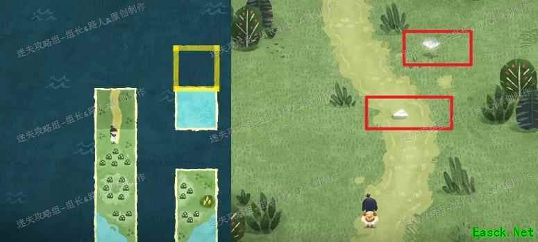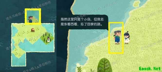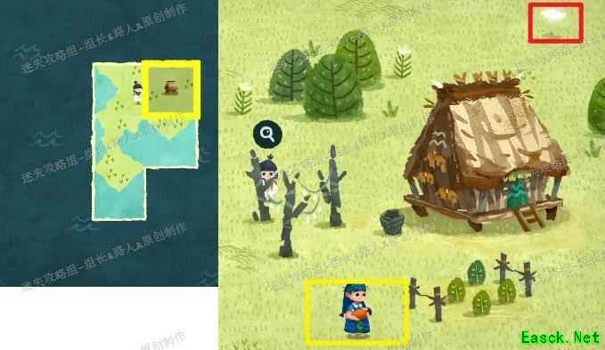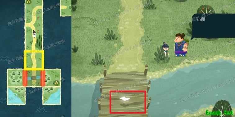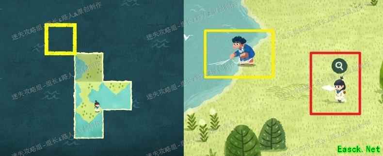 拼接完成后前往未探索区域,红框处可拾取地图碎片,黄框处与大叔对话触发剧情。