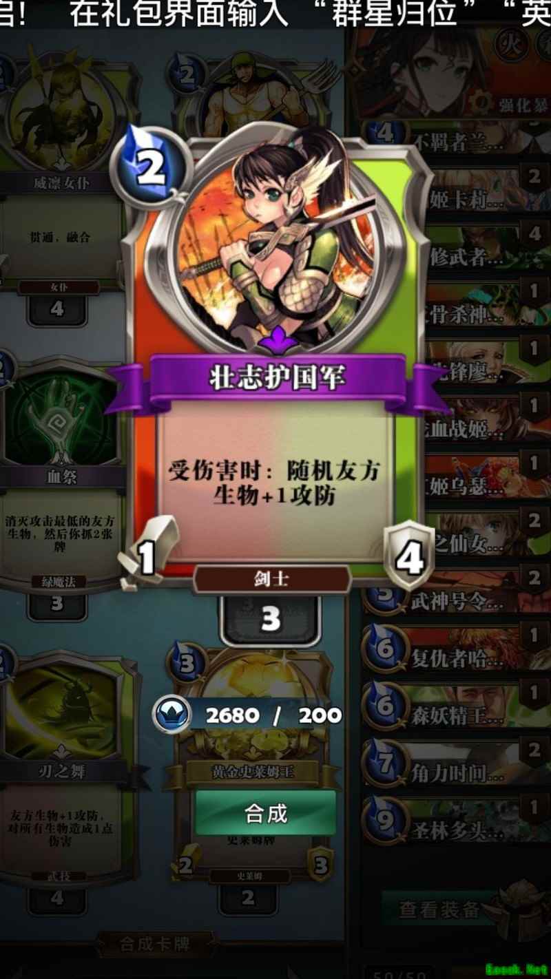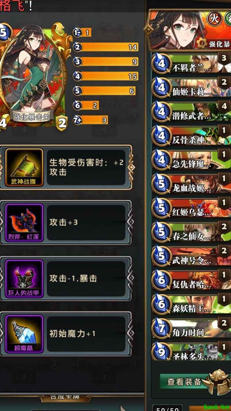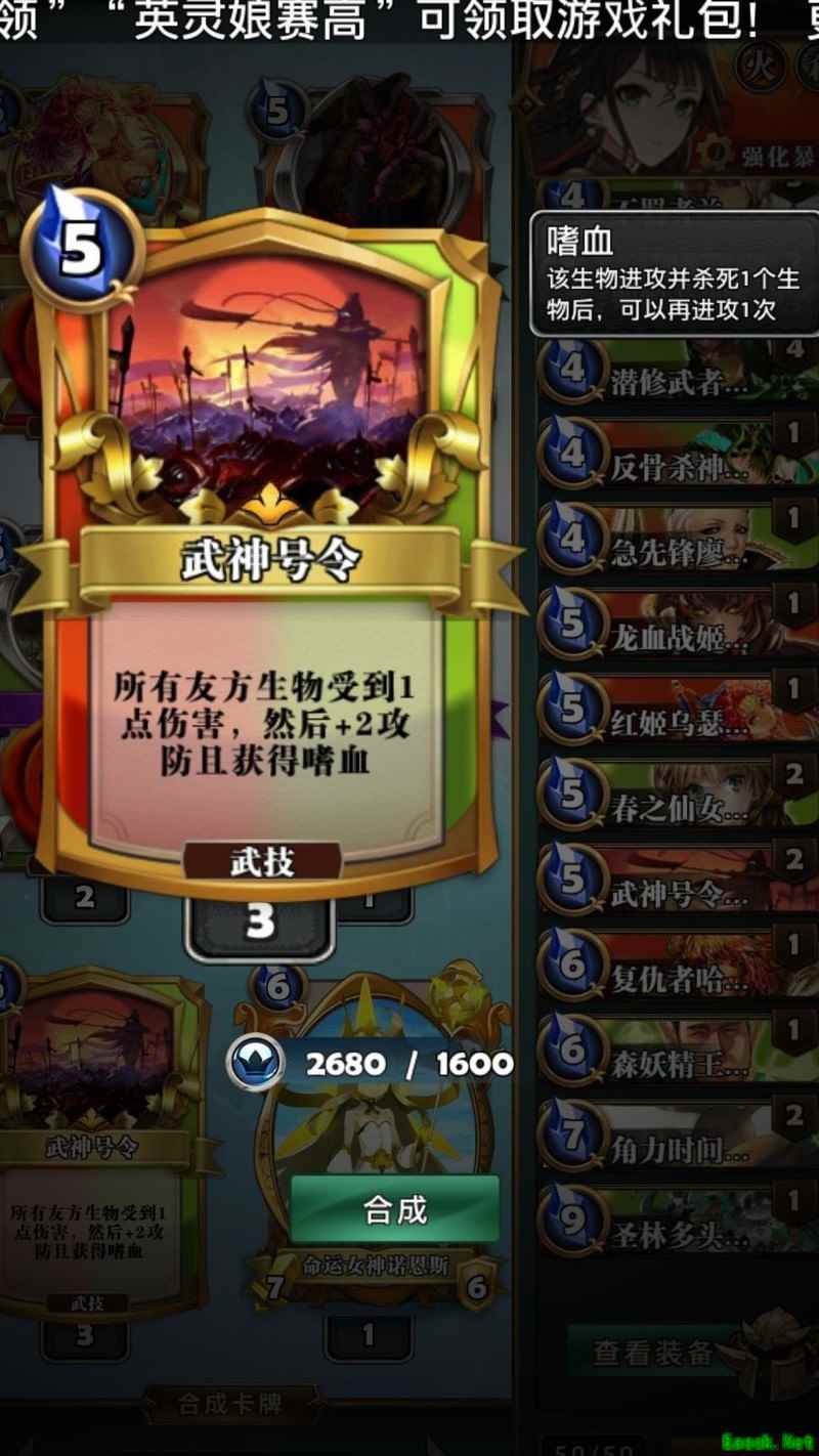 只需一个回合,便可召唤出拥有7攻7血且具备4点魔法抗性的强力单位,配合狼人被动,单回合伤害高达14点。卡组中许多带嗜血效果的怪物和强化卡牌获取难度低、造价亲民,例如预选卡中的魏延、关琳,搭配狼人与食人魔战士,能快速组建高爆发阵容。即便缺少顶级大怪,低费阶段也能打出可观输出。接下来重点介绍卡组中最关键的两张核心卡,首当其冲便是战神关羽。