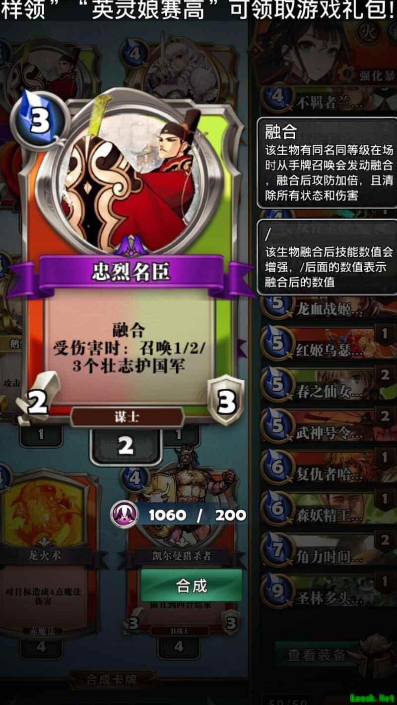 此卡与关羽配合,7费时可实现单杀对手随从并完成斩杀,极具爆发力。强化后的关羽在击杀单位后攻击可达14,轻松秒杀敌方目标。若未抽到该卡,也可借助群体伤害法术协助关羽叠加攻击力。