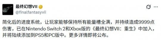 此外,官方还将未来陆续为PC版以及PS5版更新官方作弊器,让玩家能够保持所有能量槽全满,并能一直造成9999点伤害。该功能已在Switch2版和Xbox版的《最终幻想7:重生》中加入。