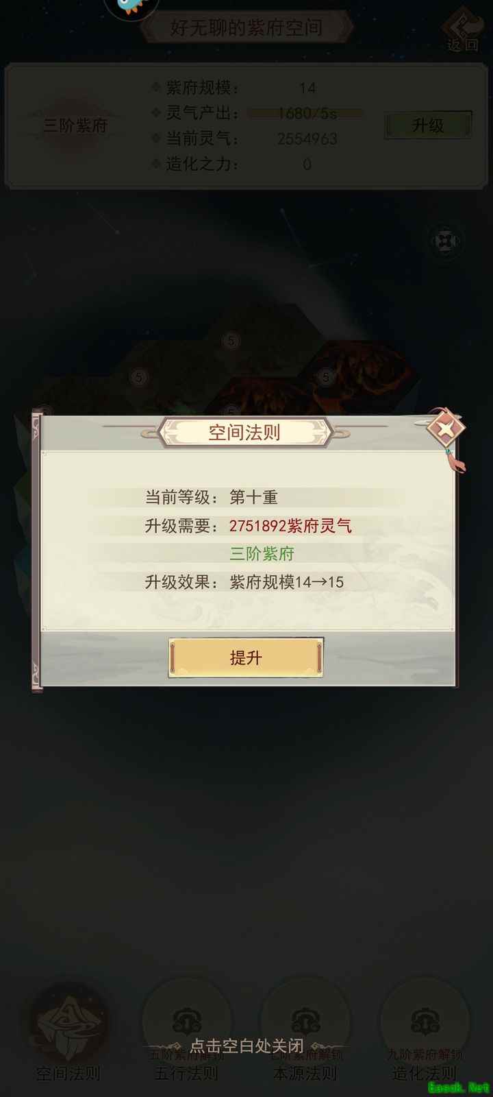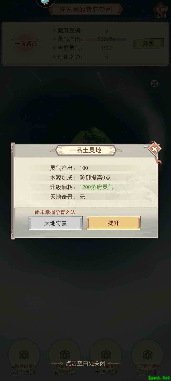 五行法则开启后,可选择提升五行法则极,每重境界提升对应属性灵地等级上限,同时升级所需灵气也会显著增加。