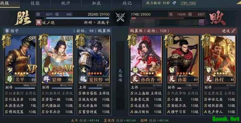 该阵容组建门槛较高,要求夏侯惇具备一定练度,并必须拥有SP关平与SP貂蝉两名核心武将。搭配中还需占用蓄势待发、博闻强识、合军共济等关键战法,相当于拆解了宝貂队、魏智队和三枪阵容。尽管投入巨大,但其作战表现同样出色,回报可观。
