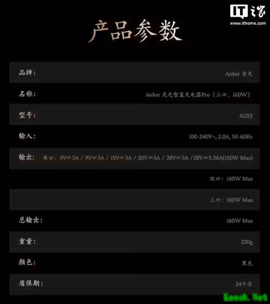 该产品在外观上采用了立体浮雕工艺,内置的彩屏带有定制充电界面。充电头提供 3 个 USB-C 接口,支持单口 140W 输出及双口 / 三口合计 160W 峰值输出。
