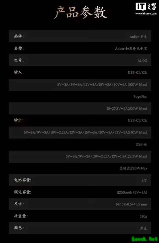 该产品同样采用立体浮雕工艺及定制充电界面,顶部带有 1 个 USB-A 接口、2 个 USB-C 接口,其中 USB-C 接口支持 140W 输出 / 100W 输入、USB-A 接口支持 22.5W 输出、三个接口合计可实现 220W 峰值输出。