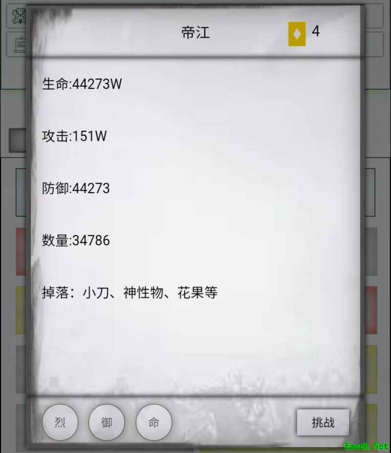 伤害原理和出战配置与樱一致,不同之处在于帝江的攻击为120-160万。长枪兵要存活需至少32万血、末代50精兵。