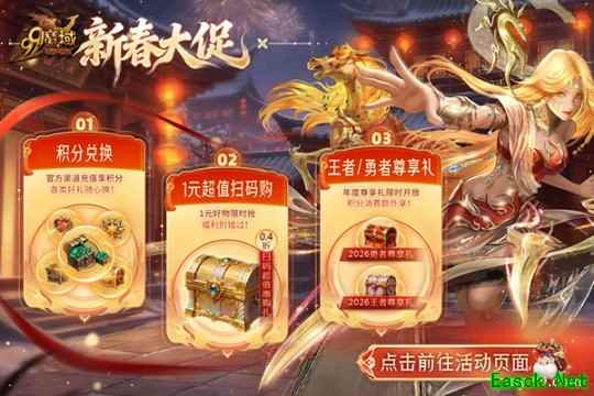 本次新春大促诚意满满!参与“新年乐购”,购买年货可享每日返利,直至零元购;三期“贺岁珍品竞拍”等您出价。更有多重加码福利:官方充值积分兑好礼、限时1元超值扫码购(部分低至0.4折),以及赠送额外积分的年度“王者/勇者尊享礼”限时开放,助您开年领先。