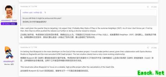 ResetEra上,有人询问“内部人士”shinobi602重制版是否为Cory Barlog的项目,他予以否认,并表示新作“快完成了,不排除延迟”。此前的报道中曾提到这款新作可能是科幻主题的全新IP。