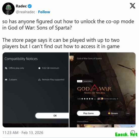 PlayStation于2026年2月13日发布2D战神 前传《战神:斯巴达之子》。该游戏商店页面标注支持1-2人游玩,预告片中也出现奎托斯与戴莫斯并肩作战的画面,但实际进入游戏后,全球玩家均无法找到合作模式的开启方式。