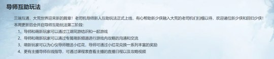 除此之外,近期更新的导师互助玩法非常不错,你可以直接通过“江湖同游”结识师傅,也可在专属频道或者直播询问自己不理解的问题。可以说,哪怕你从来没玩过这款游戏,只需找个靠谱的师傅,就能解决你一切烦恼。此外,你也可以加入玩家搬砖交流群,里面个个都是人才,说话又好听,非常有利于自己在游戏里的发展。