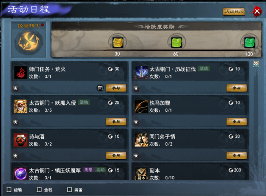 这里举个最简单的例子,《天下贰·经典版》的收益主要来源于日常任务,但你只要有系统送的装备,基本就能应付上面列表中的绝大多数日常任务。