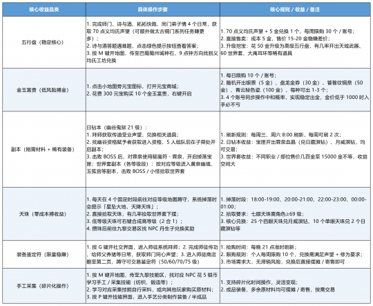如果自己碎片化时间很多,升到30级后去九黎城学个适合自己的采集技能,卖卖材料或者直接做手工套(配方副本掉落),也能赚点小钱。