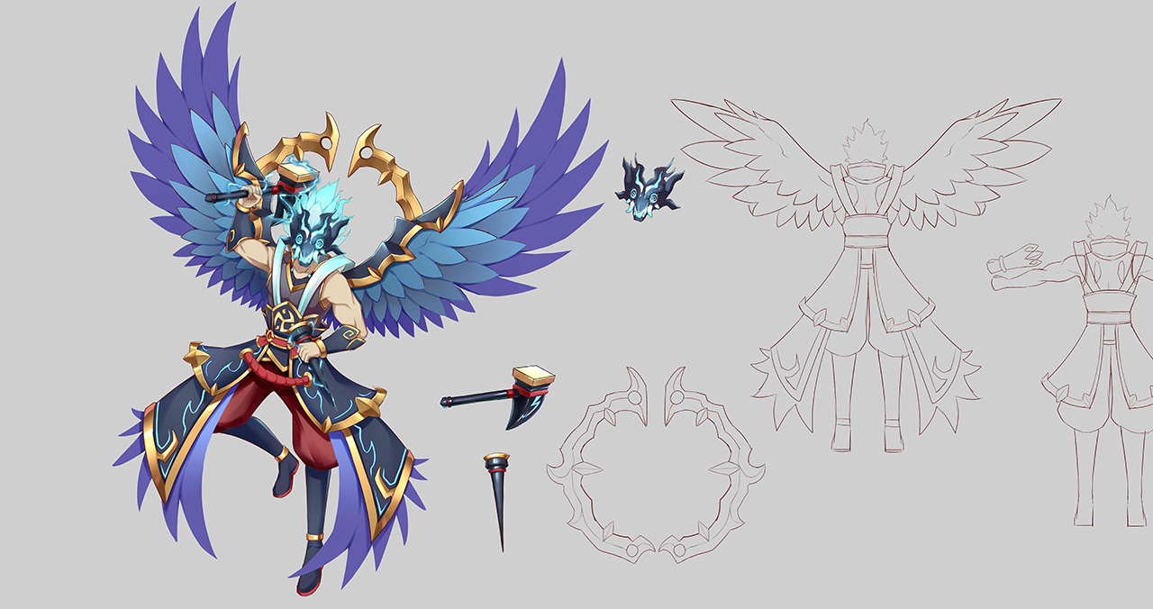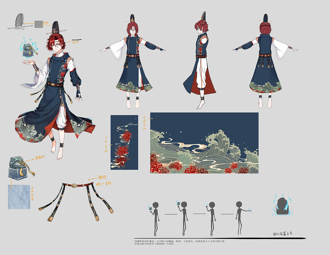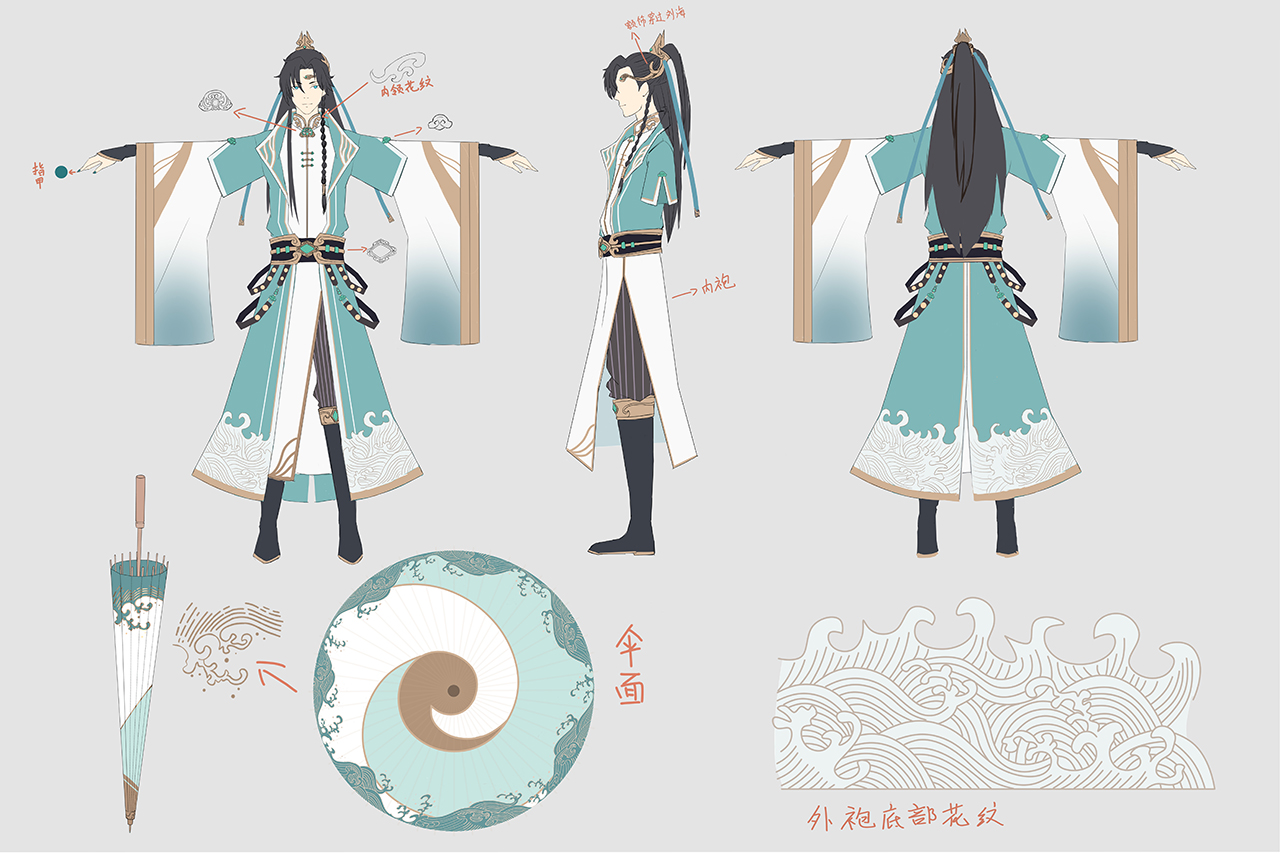 阎罗,虽然是手持印玺的少年模样,但性格沉稳,办事老练,总是一副严肃威严的样子,是一个手握地府生杀大权的地府之主。阎罗的服饰借鉴了中国唐代官服,圆领袍衫的基本形制,虽然他看着年轻,但却承担着某种“责任”。