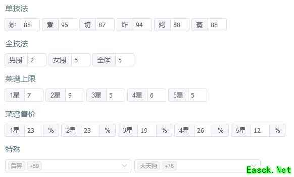 若上述限制导致无法满档,请自行通过计算器调整菜谱和厨师配置,我的选择不应成为你的束缚。