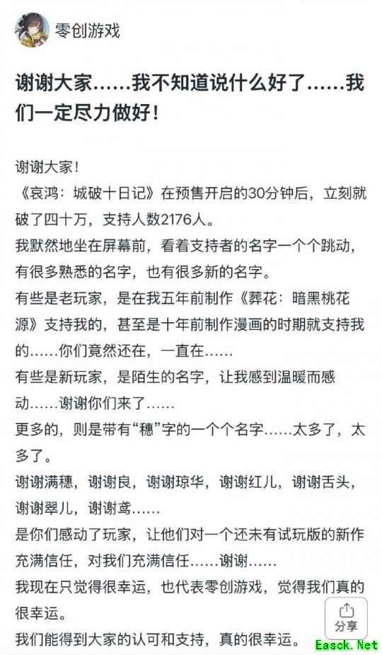 面对如此巨大的热情,工作室主创感叹仿佛置身梦境。他在屏幕前看着支持者的名字一个个跳动,其中既有陪伴了五年的老玩家,也有初次见面的新面孔,这种信任让制作团队感到幸运。