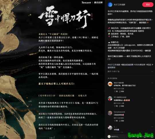 近日腾讯光子工作室在社交平台发布招聘信息,并宣布将开发两款全新的3A大作,分别是双端武侠动作夺金撤离游戏《雪中悍刀行》 ,以及高品质仙侠动作单机游戏《剑来》。此次招聘主要涵盖策划类、美术类岗位,均提供转正机会,工作地点为广州和深圳。