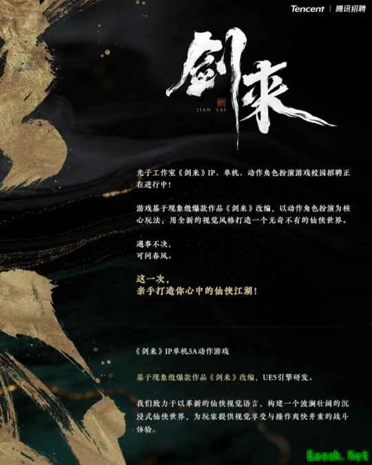 另一款项目《剑来》为3A高品质仙侠动作单机游戏,同样改编自热门IP,采用虚幻5引擎打造,以动作角色扮演为核心玩法,用全新的视觉风格打造一个无奇不有的仙侠世界。