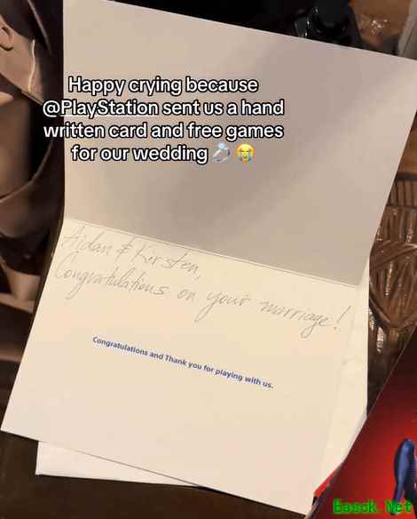 除了游戏,最让人感到暖心的是那张贺卡。卡片上既有手写祝福“新婚快乐!”,也有官方打印的致意文字,新人名字被特别点名,仪式感拉满。新娘 Kirsten 在配文中也难掩兴奋,直言这是一次“非常贴心”的惊喜,并表示自己从小就是 PlayStation 玩家。