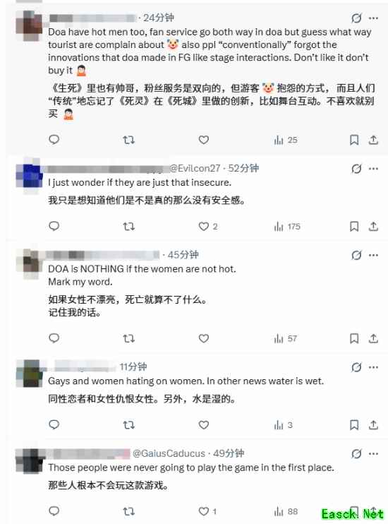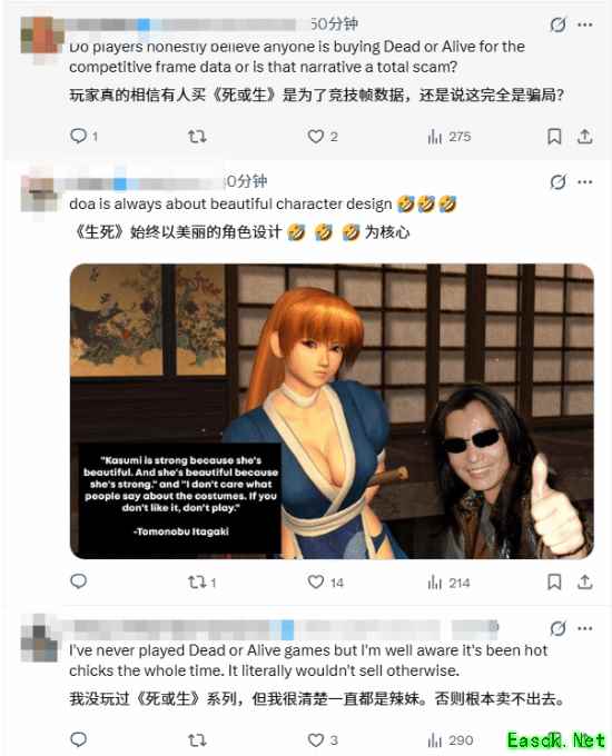 对此,不同立场的声音迅速涌现。用户 Priyanka 直言:“玩家们真的以为有人买《死或生》是为了竞技帧数数据,还是叙事是彻头彻尾的骗局?” 而用户 Yisan 则贴出系列创始人板垣伴信的经典言论回应:“霞之所以强大,是因为她很美;她之所以美,是因为她很强大。我不在乎别人对服装的看法。如果你不喜欢,就别玩。” 这一观点也得到不少玩家支持,有网友表示:“《死或生》一直都是关于漂亮的角色设计,这是它的核心特色。”