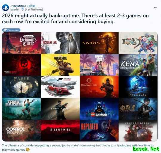 近日国外Reddit论坛网友laser16发帖“2026年大作井喷,可能会让我破产”,引发网友热议。看来2026年不仅是游戏大年,更是玩家钱包和肝的灾年!