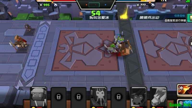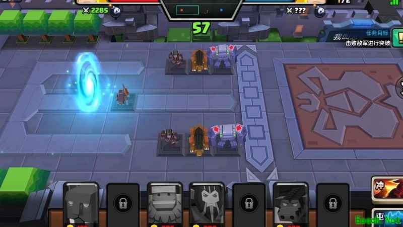 布阵5-5,前排上中下各置一只由石巨人进化的幼鹿,后排配置死亡骑士与三名火枪手协同作战。