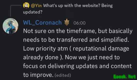 一名开发者在官方Discord中表示:“具体时间还不确定,但网站基本上需要进行迁移和精简。目前优先级不高(声誉上的损失已经造成)。现在我们更需要专注于推出更新和新内容来改进游戏。”