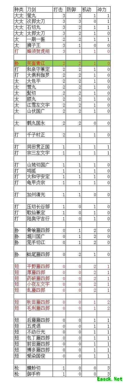 综合对比,合成刀剑中青江最优,其次为二姐、骨头/鲶尾/堀川,短刀以红字标注者为佳。宗三性能均衡,但实战应用较少。