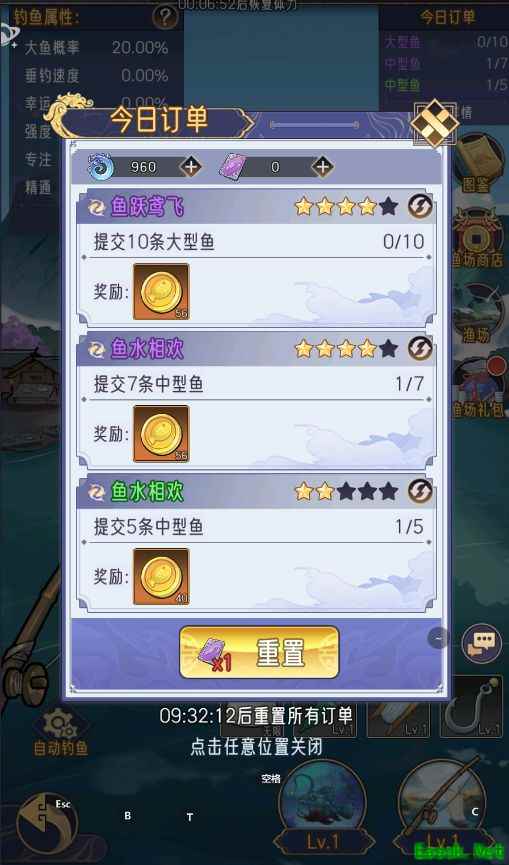 在鱼塘中,部分道具支持升级功能。建议在完成每日订单后,按照以下顺序进行升级:先升级鱼竿线,接着升级浮漂,最后升级鱼钩。如果钓鱼过程中鱼塘空间不足,优先放置稀有鱼类,并尽快提升鱼箱等级,以容纳更多鱼类。