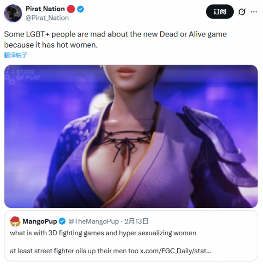 游戏博主Pirat_Natior发推文称:“一些LGBT+人士对新的《死或生》游戏感到愤怒,因为里面有性感女角”,他还附上原贴用户MangoPup的质疑:“3D格斗游戏为什么总是过度性化女性?至少街霸也会把男角弄得油光水滑。”