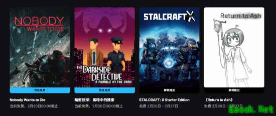 Epic游戏商城已开放领取本周最新免费游戏:MMOFPS游戏《STALCRAFT: X》(新手版)以及叙事驱动的视觉小说游戏《Return to Ash》,可在2月20日-2月27日期间领取入库。