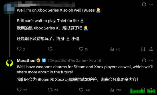 面对平台独占饰品的质疑,官方在推特上紧急回复称:“别慌!Steam和Xbox玩家也会有专属的武器挂饰,未来会公布更多细节!”