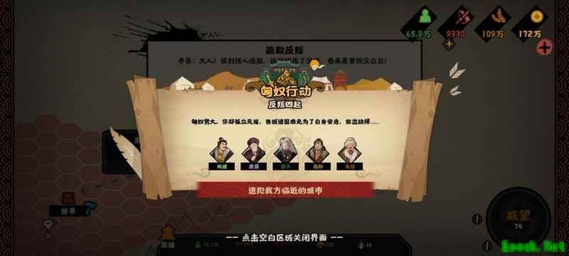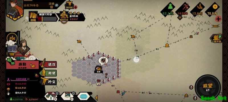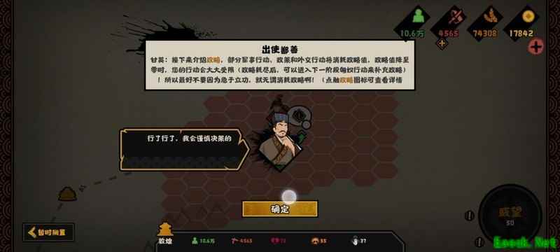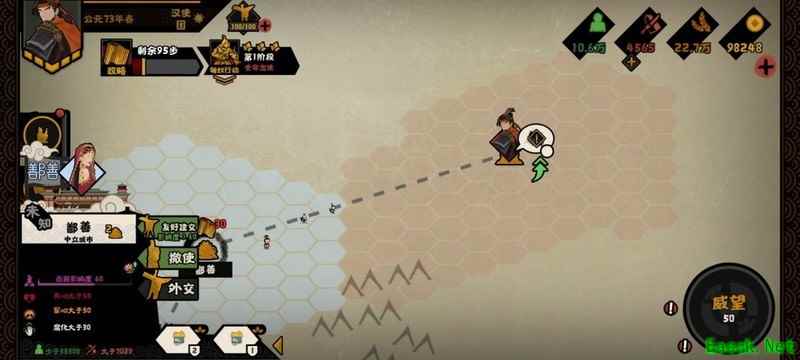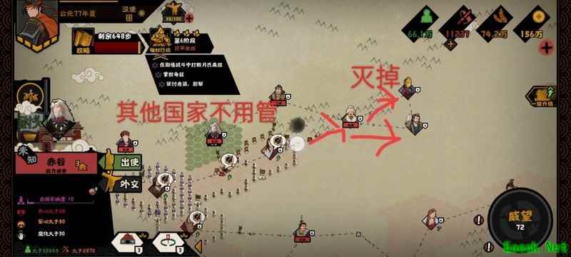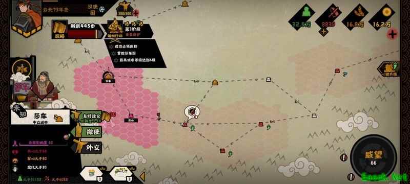 首先攻占鄯善国,接着触发随机事件并赢得战斗,即可进入下一阶段。第一阶段的政略资源已足够,暂时无需理会其他国家。