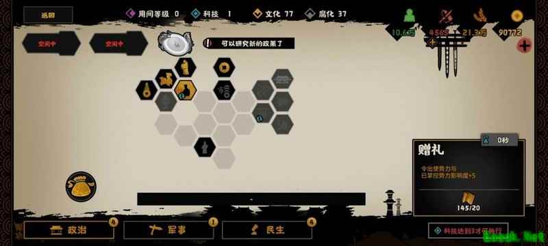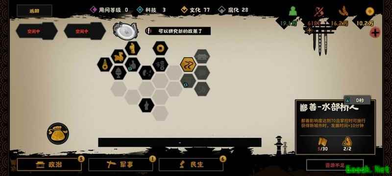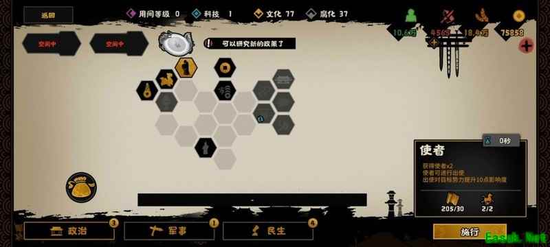 提升影响力主要依赖政策循环,这需要科技点支持,而科技政策位于民生领域。