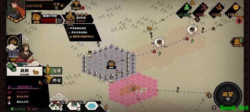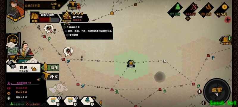 有马场的地方便可修建兵营,将拘迷、康居、于阗、疏勒的影响提升至60。此时除拘迷和康居外,其余地区已被我们掌控,可同时对这两个国家展开外交,循环提升影响力。