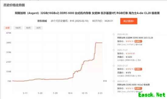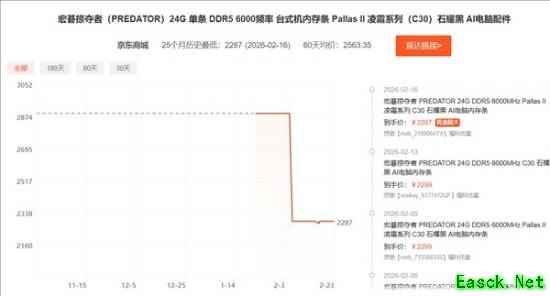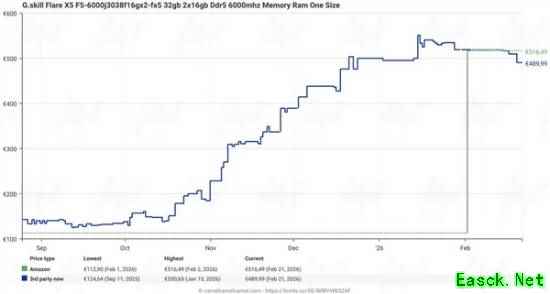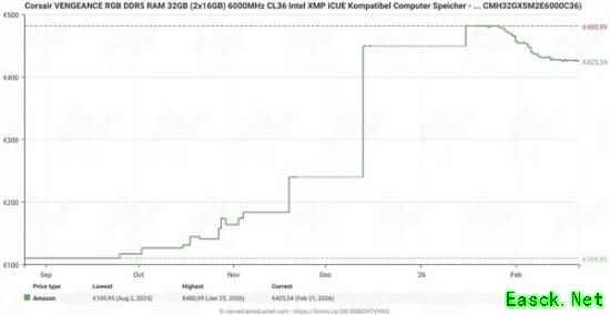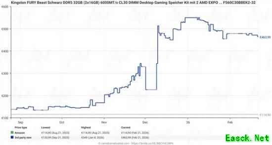 此外,Tom's Hardware跟踪了欧洲亚马逊上五款32GBDDR5-6000/6400内存的价格走势,发现其中两款出现价格回落。其中,海盗船内存从2月初的480欧元(约合3921元人民币)降至425美元(约合2936元人民币),金士顿内存则从1月初的550欧元(约合4492元人民币)降至463欧元(约合3772元人民币)。