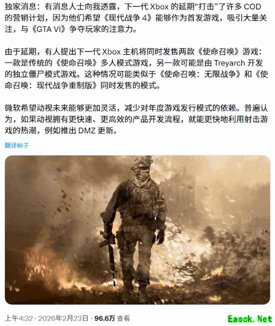爆料称,微软原本希望用《现代战争4》作为次世代主机首发护航作,与《GTA6》等大作正面对决,但主机延期打乱了节奏。作为替代方案,内部正讨论一种“双版本同步发售”模式:一款传统多人 COD 游戏 + 一款独立僵尸游戏,类似当年《无限战争》与《现代战争 重制版》的捆绑组合。