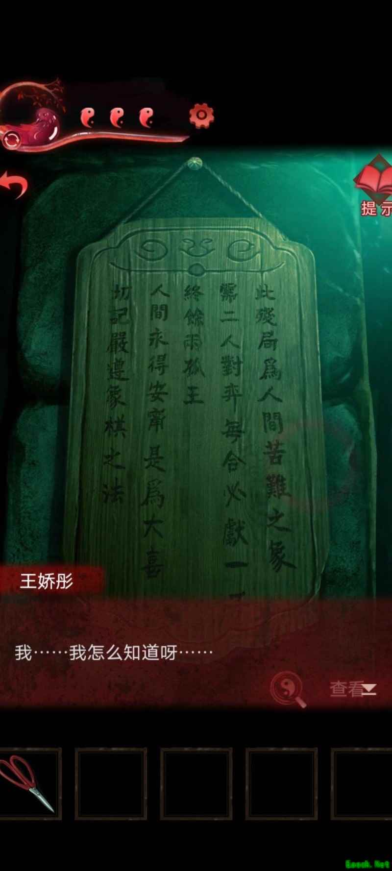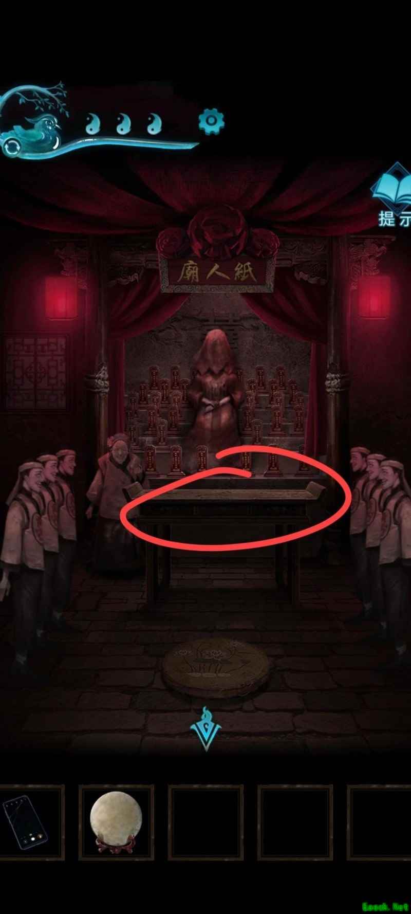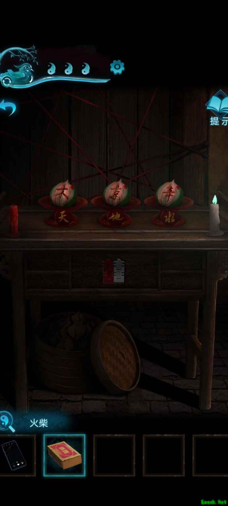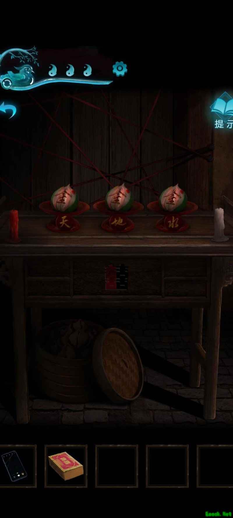 返回祠堂,查看左侧桌上的食物,将原有文字替换为已掌握的线索信息。