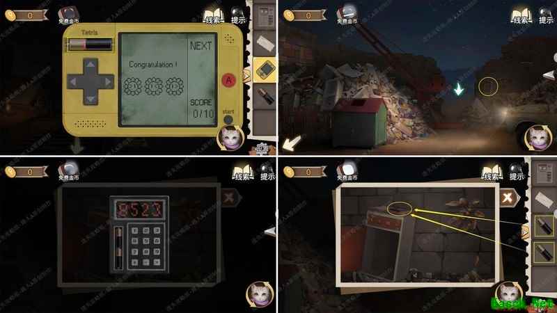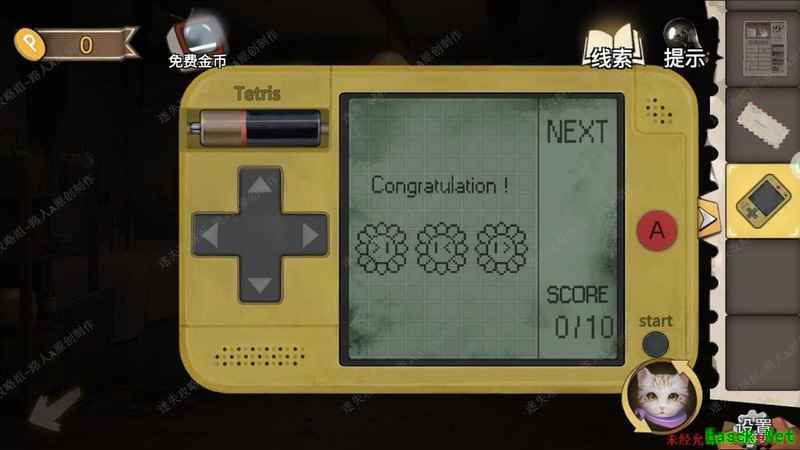 检查物品栏中的游戏机,安装电池后运行俄罗斯方块小游戏,通关后获取关键线索信息。