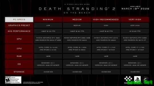 近日小岛工作室正式公布了《死亡搁浅2:冥滩之上》PC版配置需求,玩家想要在4K分辨率下流畅运行,需要RTX 4080级别显卡。