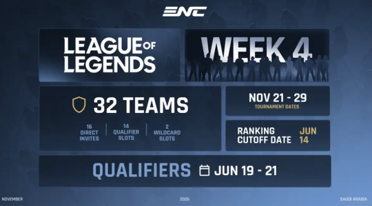 意图打造世界电竞之都的沙特·利雅得即将举行世界最大规模的电竞综合大赛EsportsNationsCup2026,今天官方发布了最新《英雄联盟》参赛规则,预计总赏金高达150万美元,将有32支国家代表队参加现场角逐,敬请期待。