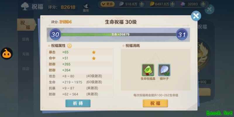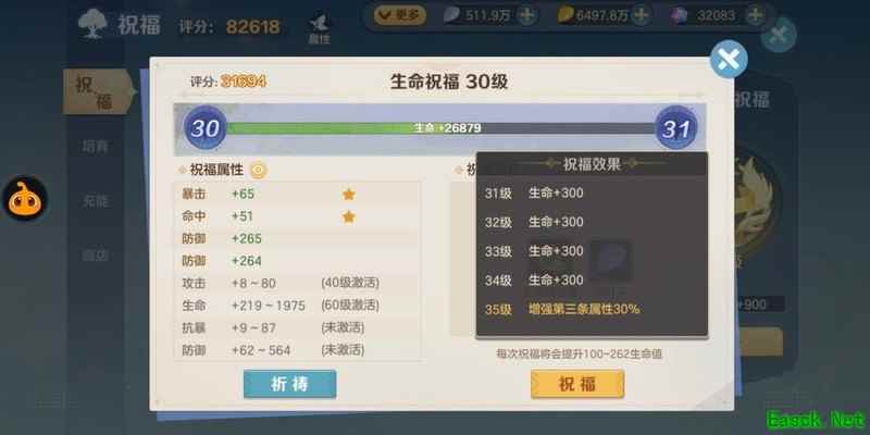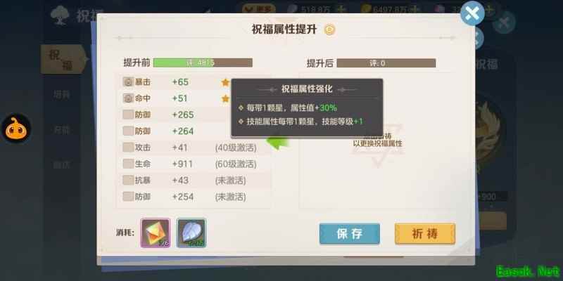 提升祝福等级的意义不仅在于小幅增强攻击、防御和生命等基础属性,更在于达到特定等级后可以解锁一条新的祈祷属性。此外,祝福等级的提升还能为祈祷属性附加一颗提升30%增强属性的星星。对于关键的高级属性而言,这30%的额外加成效果尤为重要,能显著提升整体战力。