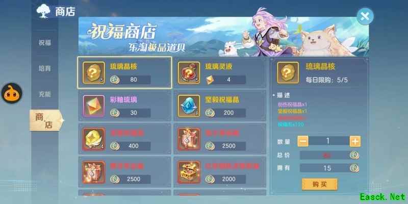 由于祝福树祈祷需消耗大量彩釉琉璃,建议大家优先兑换每日限购5个的80分琉璃晶核,其次是较难获取的圣能祝福晶,不建议兑换2000分的极品宠装箱子,其他物品可暂不考虑。